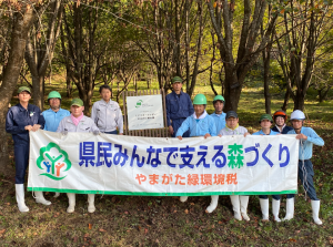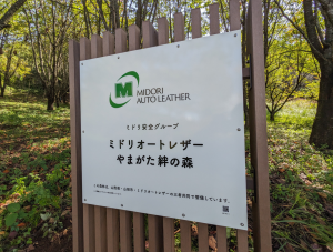 10月3日(金)に「ミドリオートレザーやまがた絆の森」の森林整備活動及び、看板の設置と除幕式を行いました。